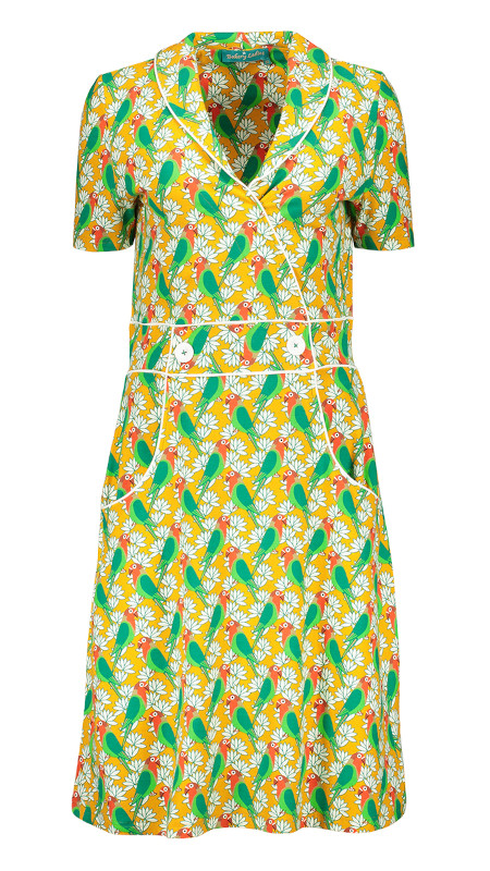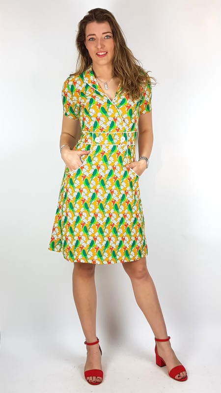 De kleur van de jurk is donkergeel en de superleuke vogelprint is uitgevoerd in twee tinten groen, rood en wit.
