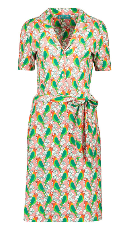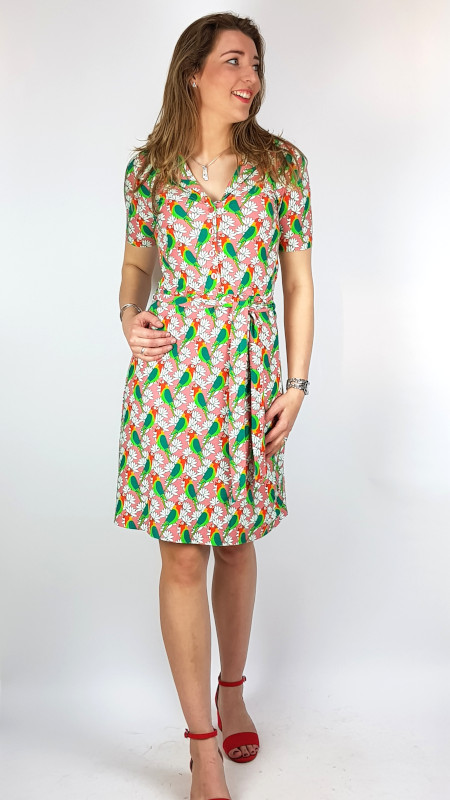 Fijne jurk met een vrolijke en kleurrijke print van papegaaien op een lichtroze basis.