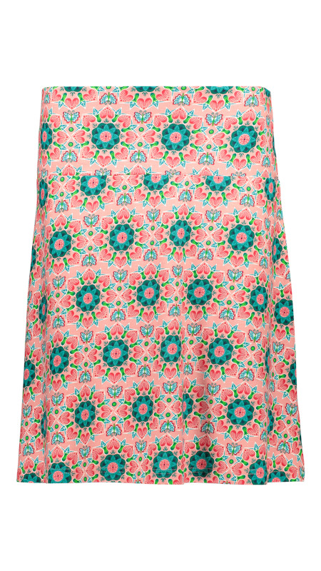 Zacht roze Bakery Ladies rokje met print van bloemen en vlinders in groen, wit, rood en turquoise.