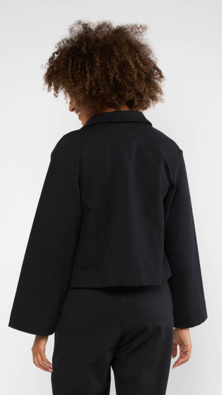 Dit is een iets losjes vallend jasje in kort model met een rond kraagje, lange flared mouwen, knoopsluiting en zakken.