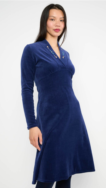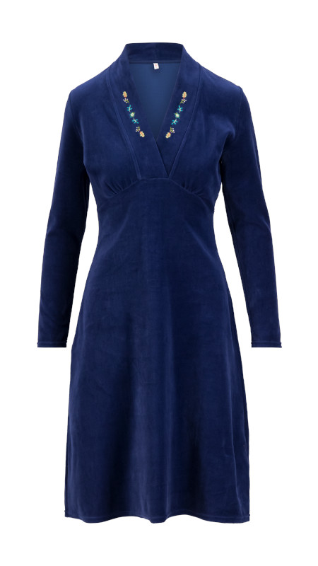 Blauwe velvet Blutsgeschwister jurk met subtiel borduursel op de halslijn.