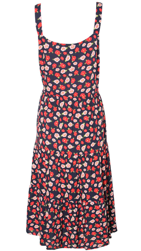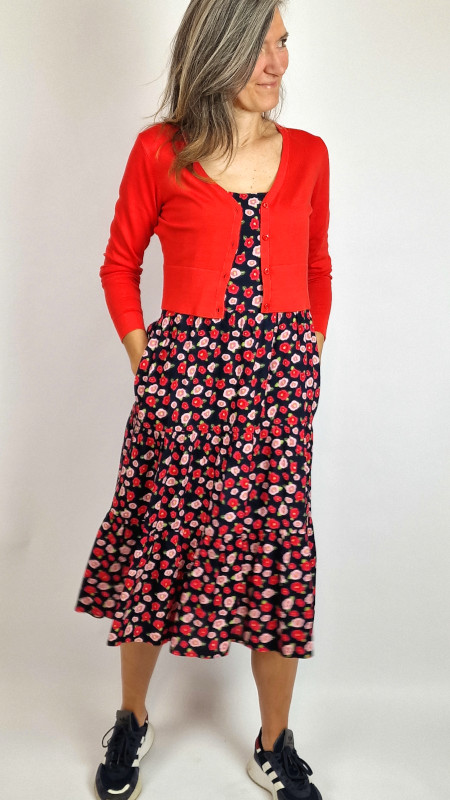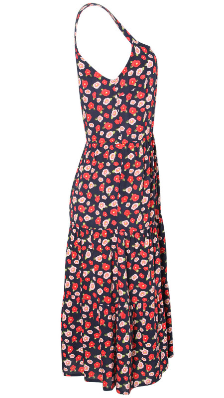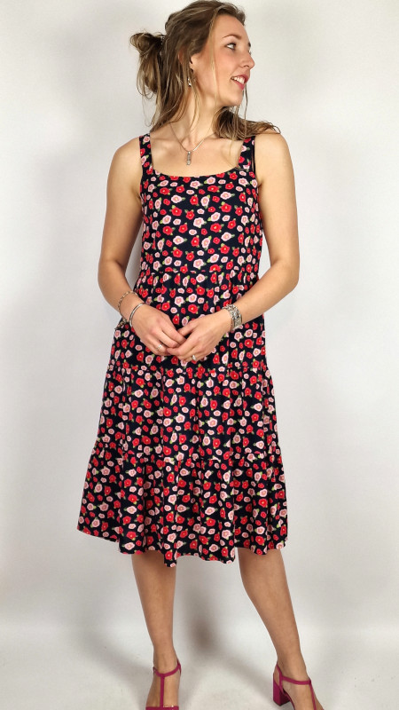 Donkerblauwe Circus strokenjurk met bloemenprint in roodtinten en een detail lichtgroen.