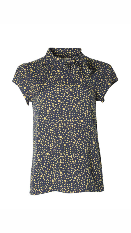 De basis van deze top is donkerblauw, met een zachtgele stippenprint.