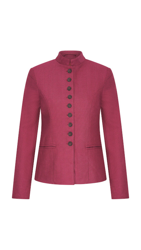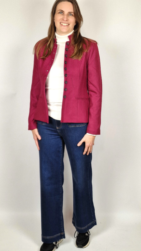 Dit is een prachtig getailleerd kort jasje in framboosrood met donkerrood visgraatmotief.
