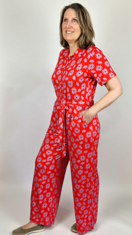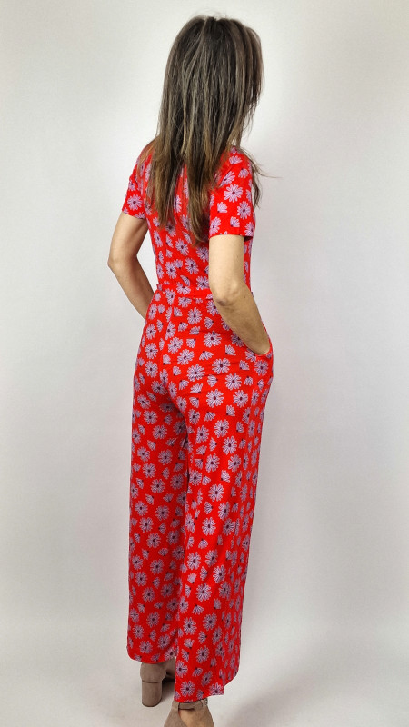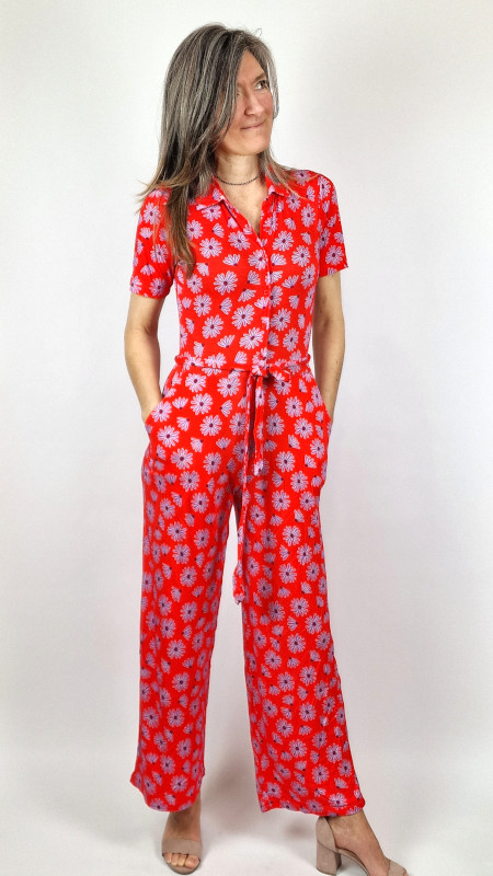 Rode Compania Fantastica jumpsuit met print van lichtpaarse bloemen met een donkerrood hart.