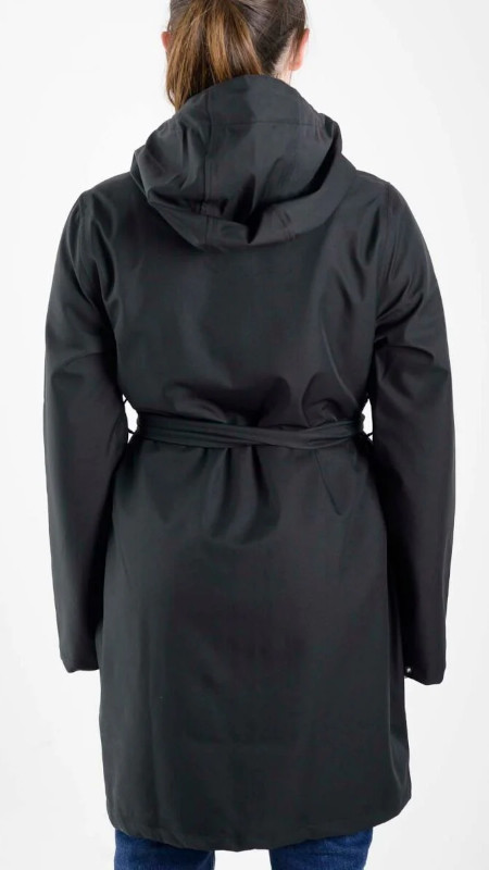 De jas is gemaakt van rekbaar polyester en heeft getapete naden.