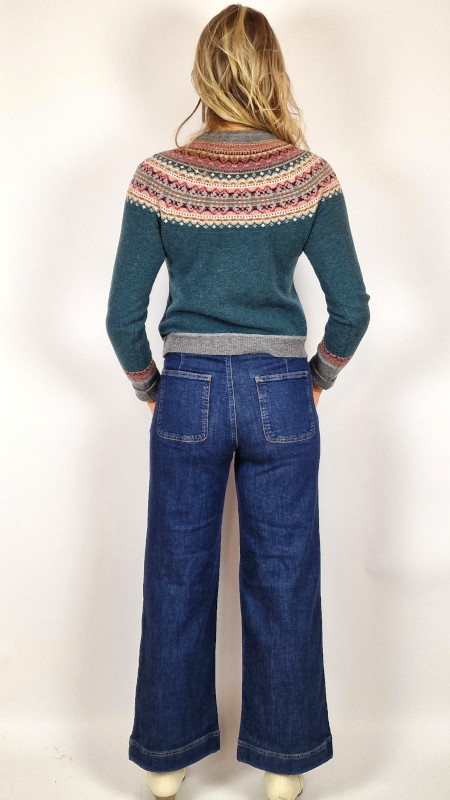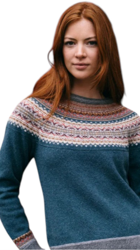 Petrol Eribé trui met Fair Isle patroon in grijs, offwhite, camel, taupe en twee tinten rood.