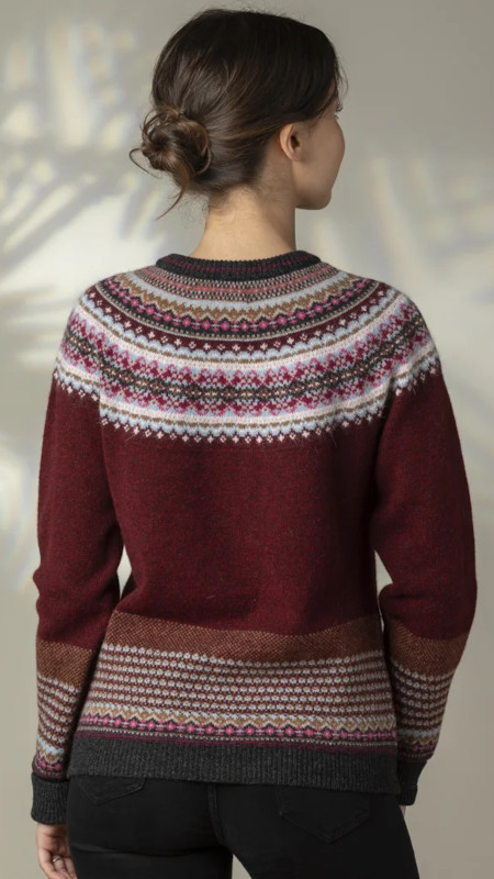 Bordeauxrood Eribé vest met Fair Isle patroon in antraciet, roze, lichtblauw en crèmewit, beige en bruin met de boorden in antraciet en bordeauxrood.