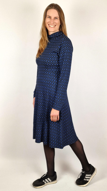 De grafische print is uitgevoerd in kobaltblauw en de basis van de jurk is zwart.