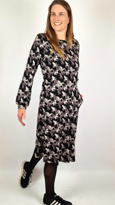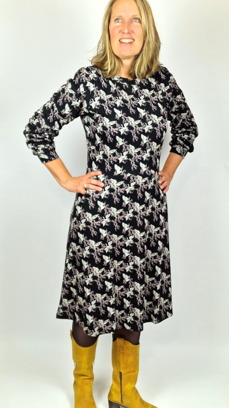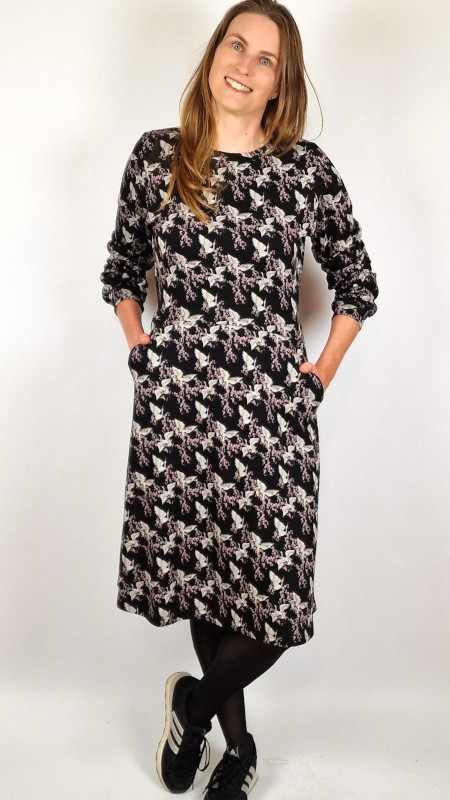 De jurk heeft een ronde hals, iets wijdere mouwen, steekzakken en een zwierige rok tot (ruim) over de knie (afhankelijk van je lengte).