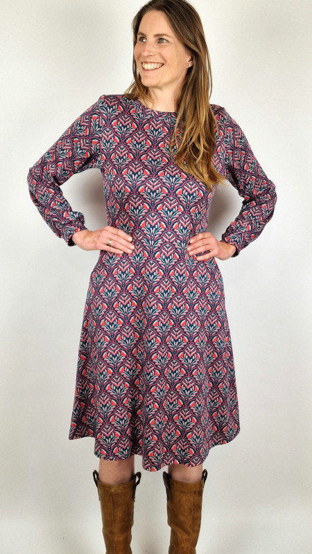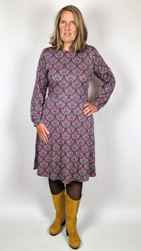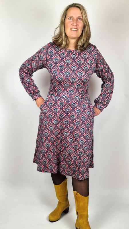 De jurk heeft een ronde hals, iets wijdere mouwen, steekzakken en een zwierige rok tot (ruim) over de knie (afhankelijk van je lengte).