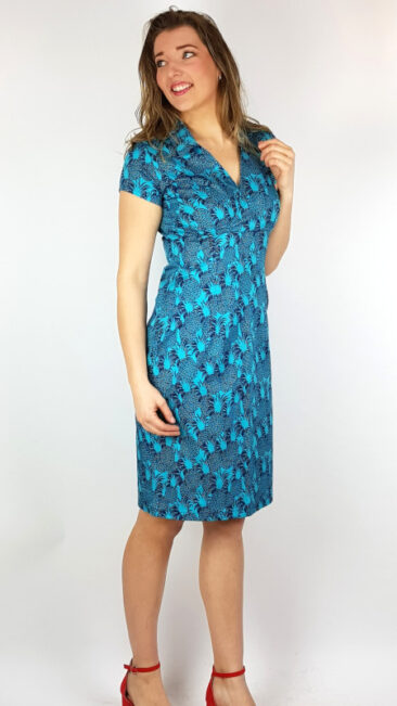 Aansluitende Ich Jane jurk met een print van donkerblauwe ananassen op een turquoise basis.