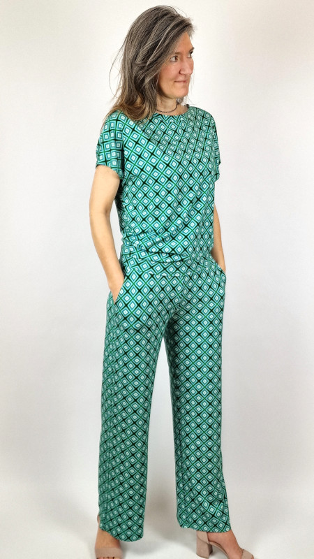 Combineer je deze top met de broek in dezelfde print, dan heb je het idee van een jumpsuit (foto 2).