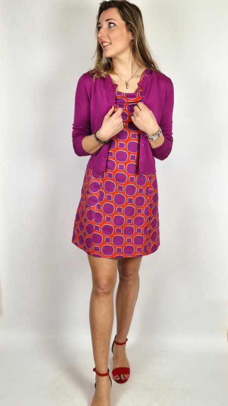 Op foto 3 wordt het jurkje gecombineerd met een fuchsiaroze bamboe vestje van ZILCH.