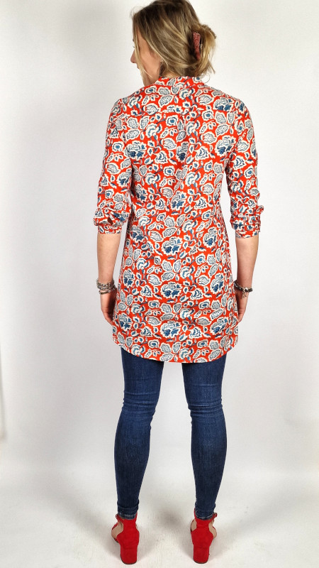 Rood met blauwe Kali-Yog blouse in tuniekmodel.