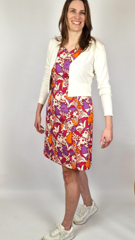 Mouwloos roestrood Kali-Yog jurkje met print in paars, oranje, fuchsia en offwhite.