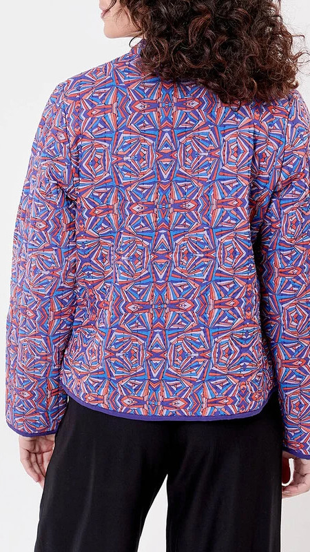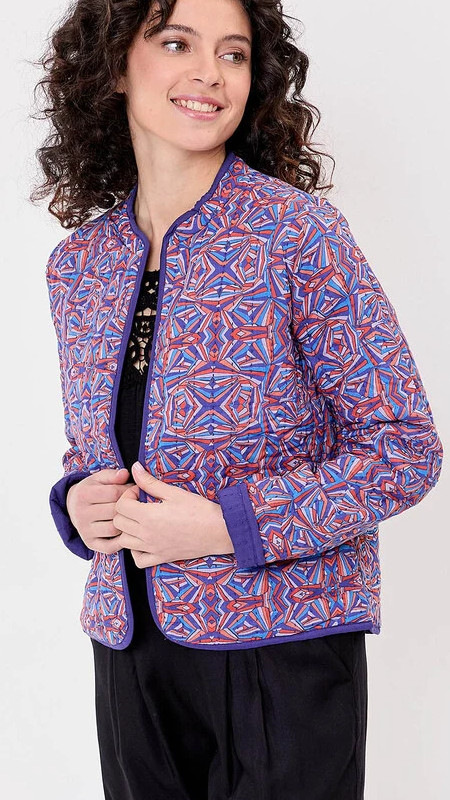 Reversible La Fiancee jasje met print in blauw, donkerpaars, koraal en lila en een donkerpaarse binnenzijde.