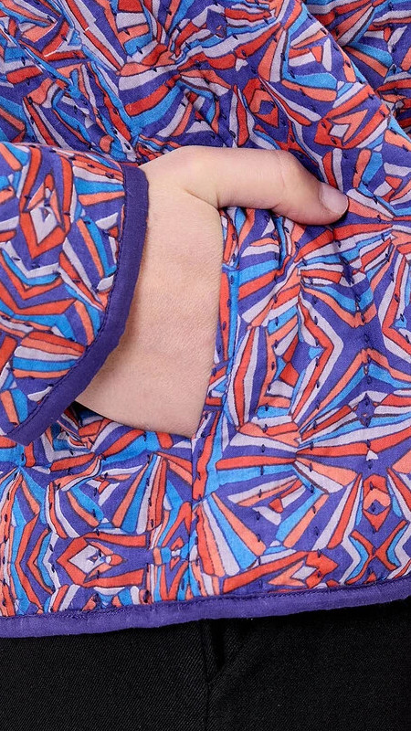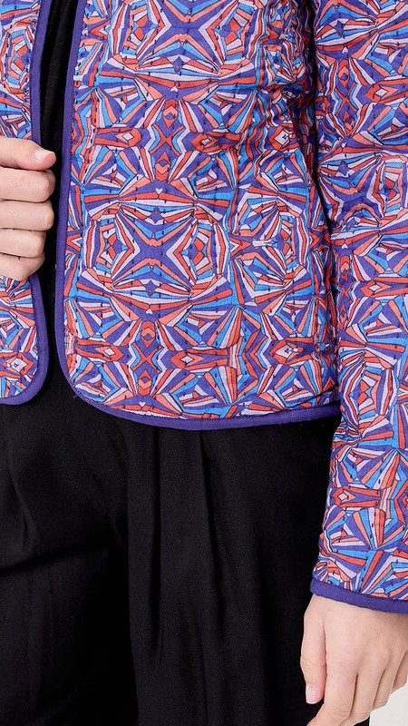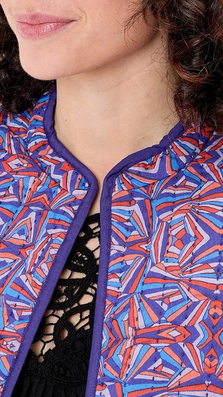 De katoenen stof is heel mooi doorgestikt en je kunt het jasje dus met print en in het effen donkerpaars dragen.