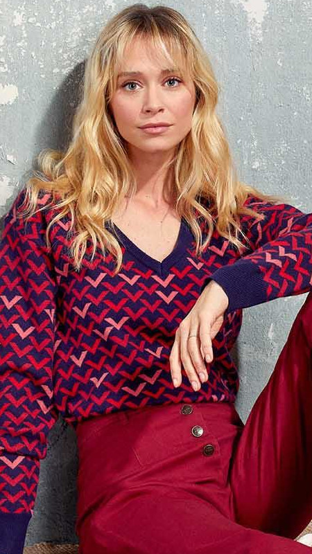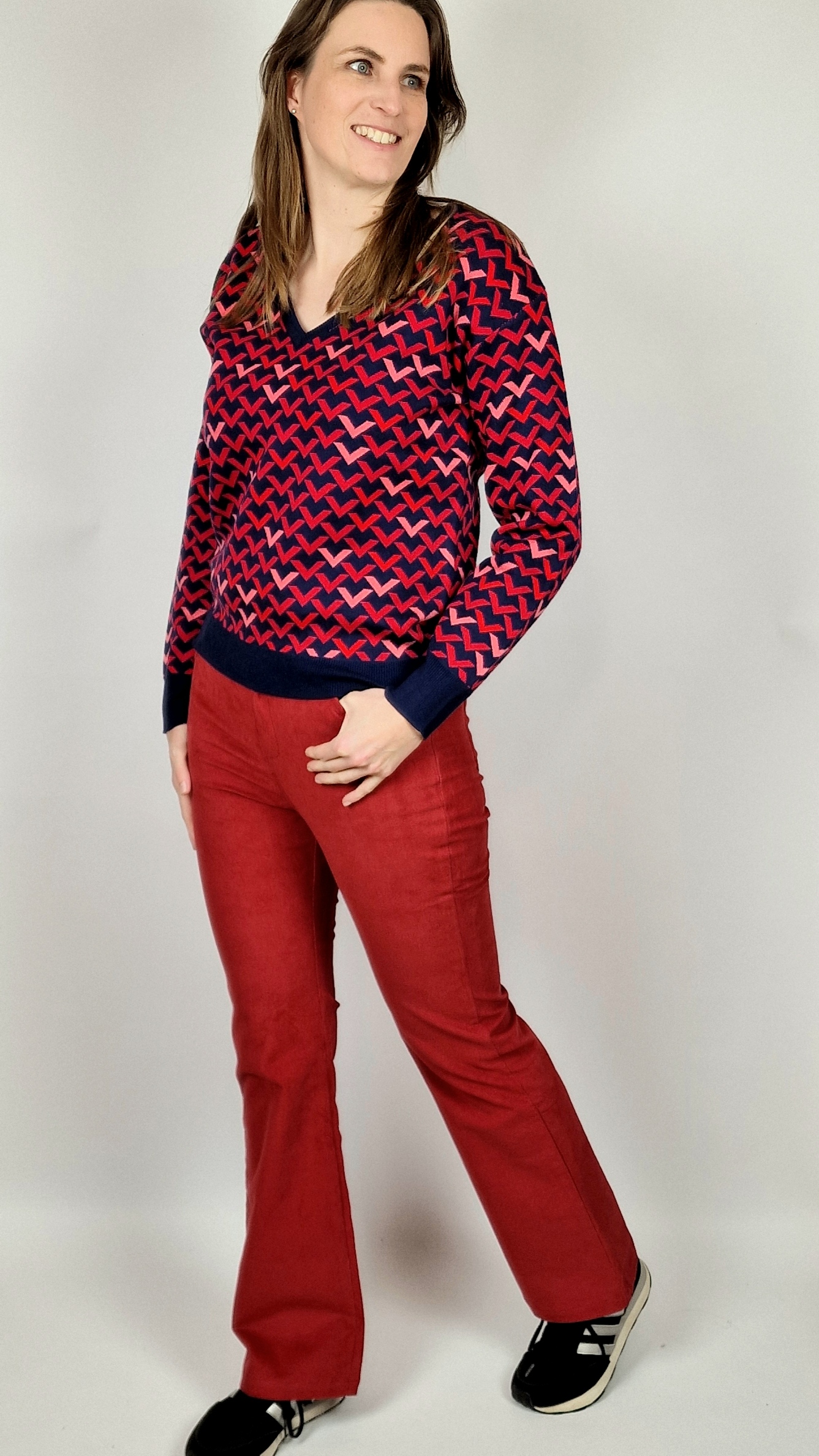Donkerblauw La Fiancee truitje met geometrisch motief van V-tjes in twee tinten rood.