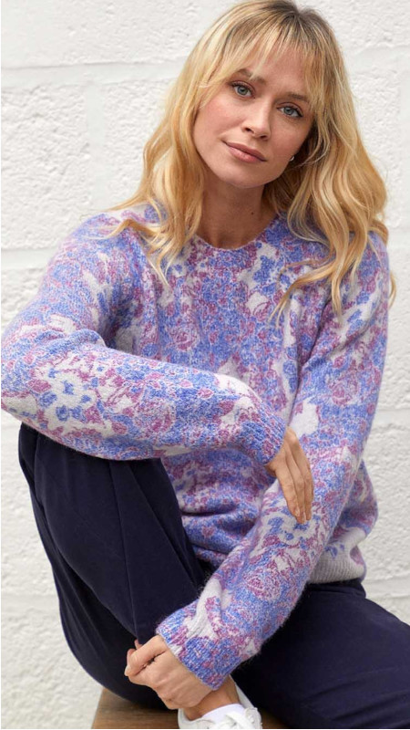 De kleuren van het truitje zijn licht paarsblauw, donkerroze en offwhite.