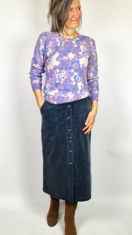 Op foto 2 wordt de trui gecombineerd met een lange corduroy rok (foto 2).