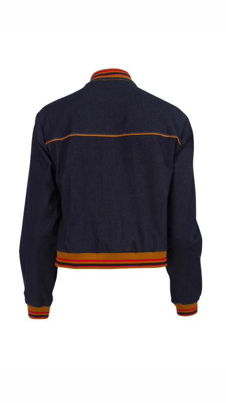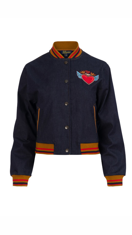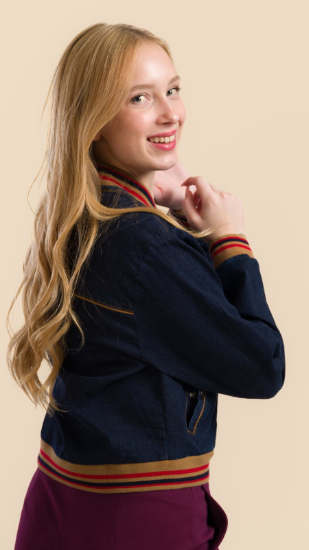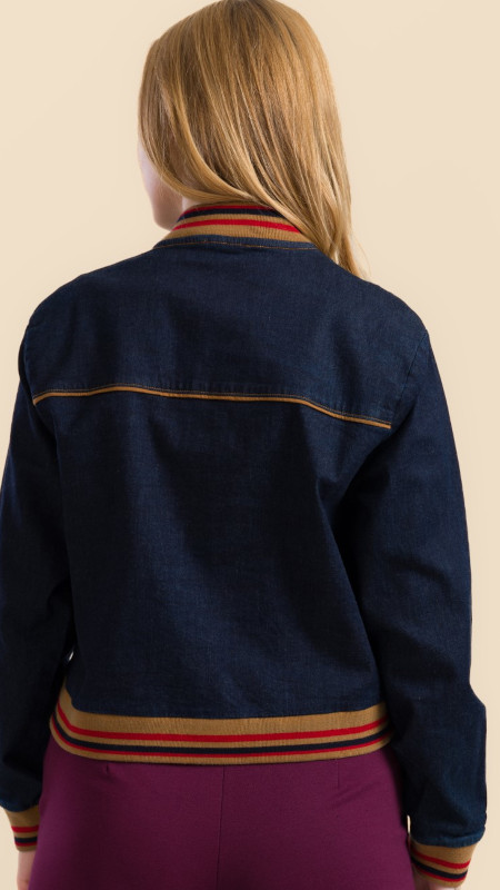 Donkerblauw denim Lalamour jacket met okergele en rode details.