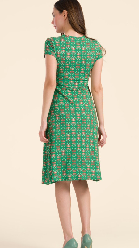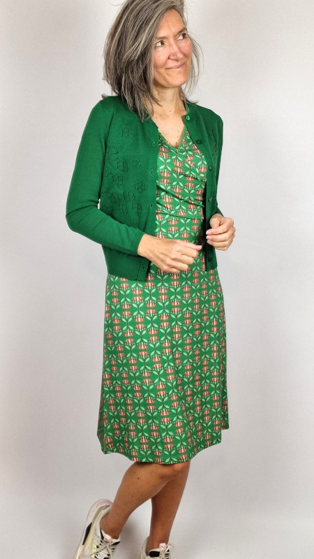 Groene Lalamour jurk met print in lichtgroen en diverse tinten rood.