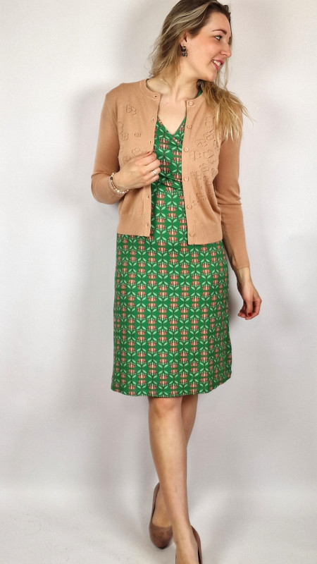 Goed vallende jurk met overslaghals, een kort mouwtje en een A-lijn tot op of over de knie (afhankelijk van je lengte).