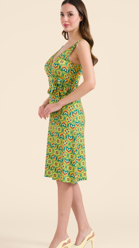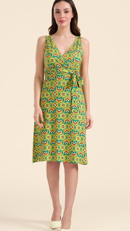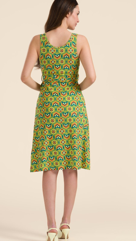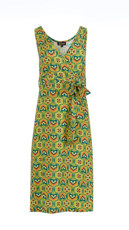 Mouwloze Lalamour jurk met retro print in twee tinten groen, petrol en oranje op een licht olijfgroene basis.