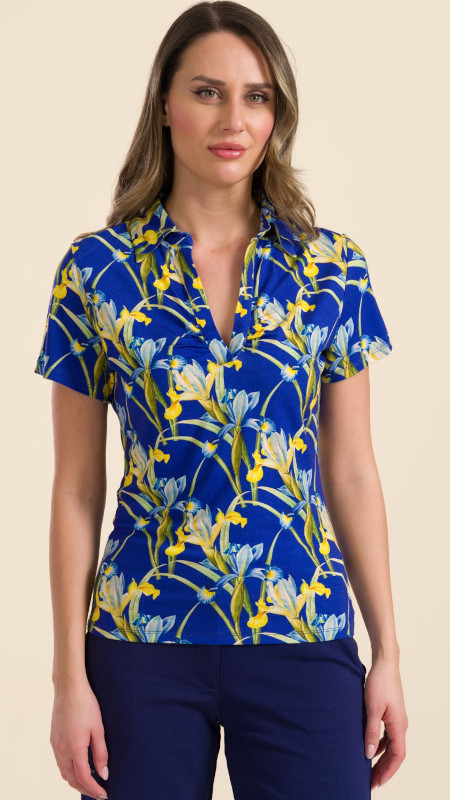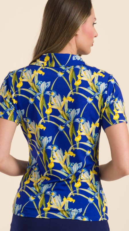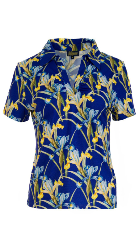 Kobaltblauw Lalamour shirt met print van lelies in geel, lichtblauw en groen.