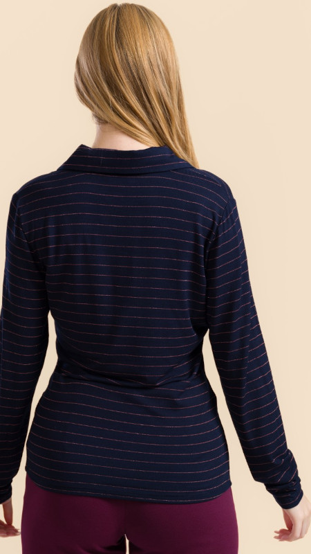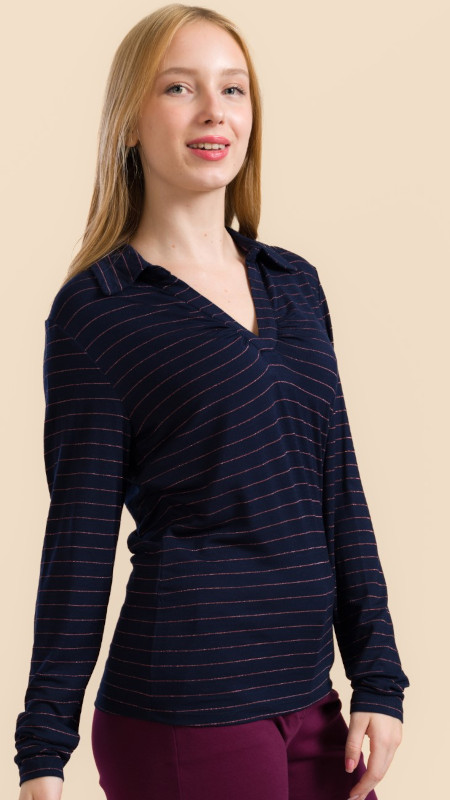 Donkerblauw Lalamour streepshirt met rose goud lurexdraad voor extra sparkle.