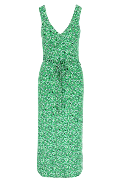 Mouwloze groene Lily Balou jurk met print in donker- en lichtblauw en wit.