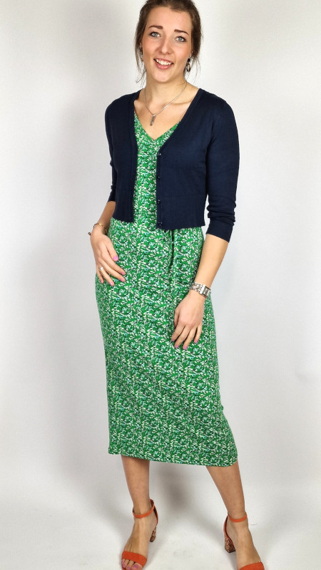 Mooi met een donkerblauw vestje (foto 2). Het vestje Vanessa chalk staat ook prachtig op deze jurk!