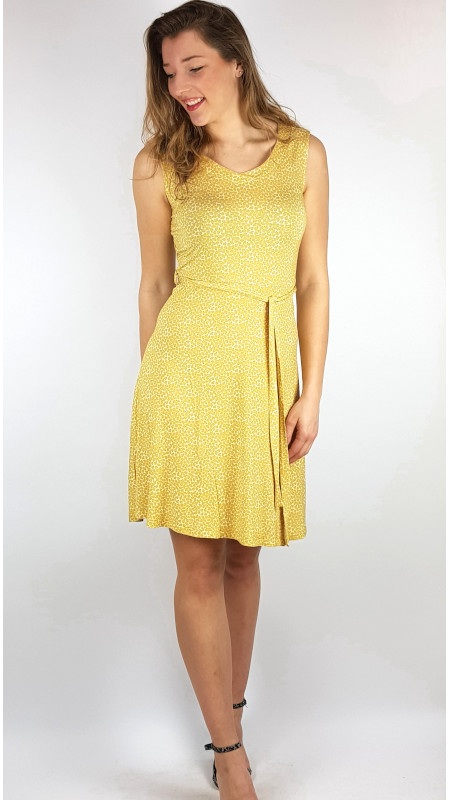 Dit jurkje heeft een niet al te diepe V-hals en een striklint in de taille.