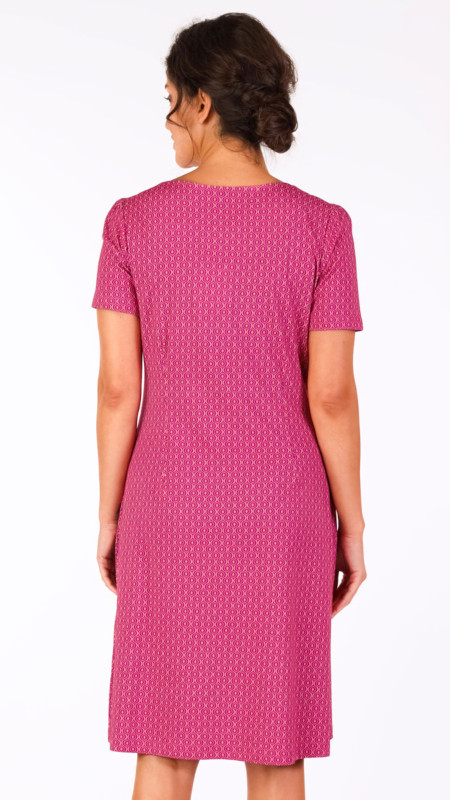 Lykka du nord jurk met geometrische print in twee tinten roze op een paarse basis.