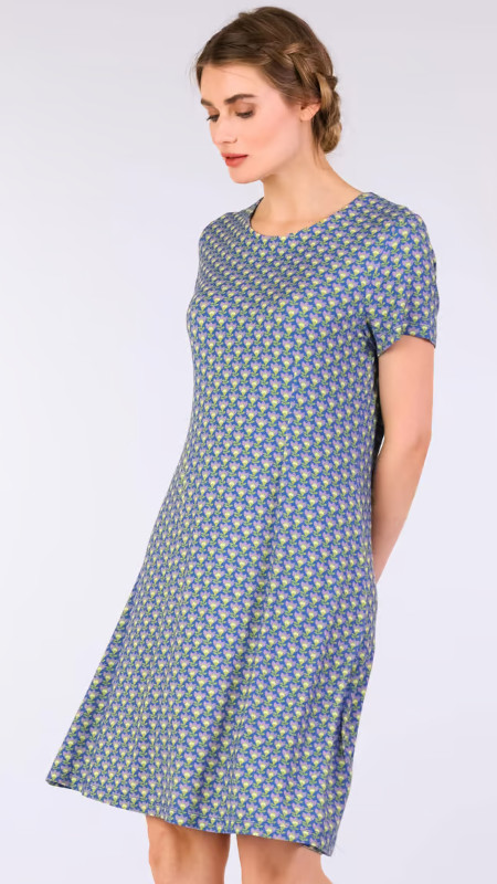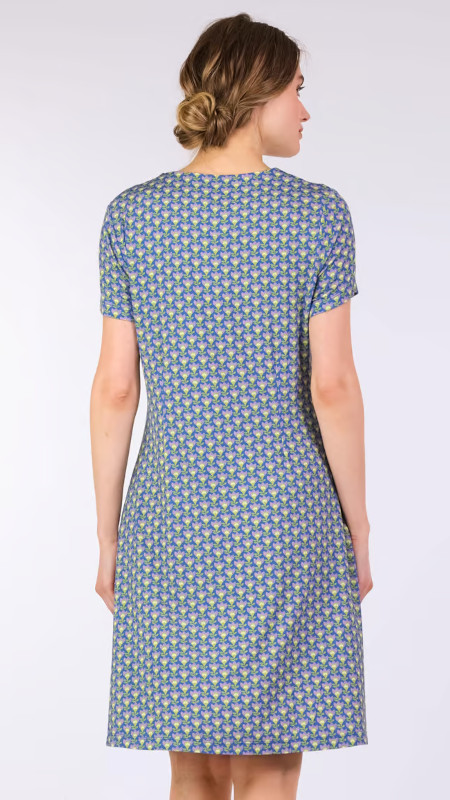 Dit mooie jurkje heeft een ronde hals, korte mouwtjes en uitlopende rok tot boven of op de knie (afhankelijk van je lengte).