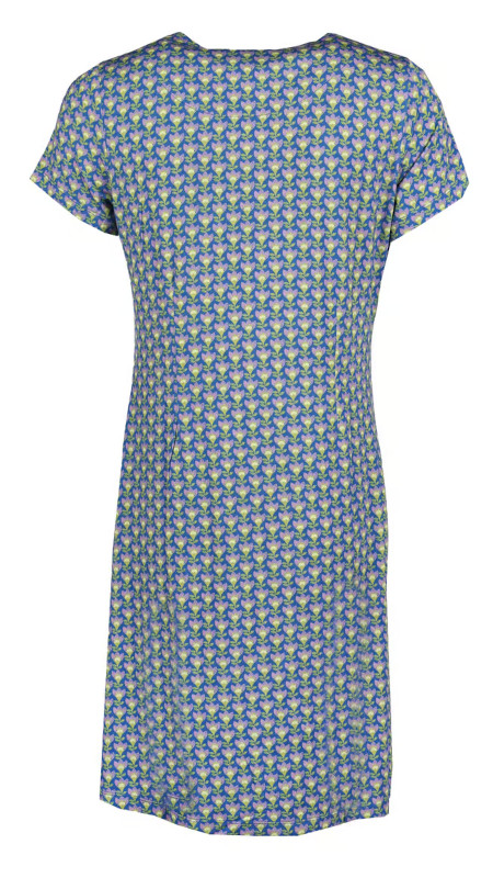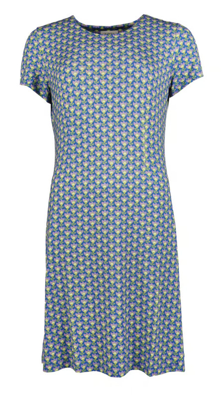 Vrolijk Lykka du Nord jurkje met print in roze en twee tinten groen op een blauwe basis.
