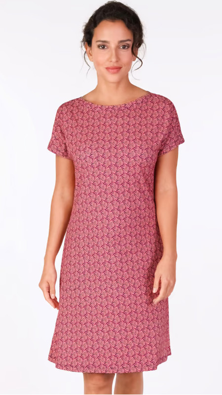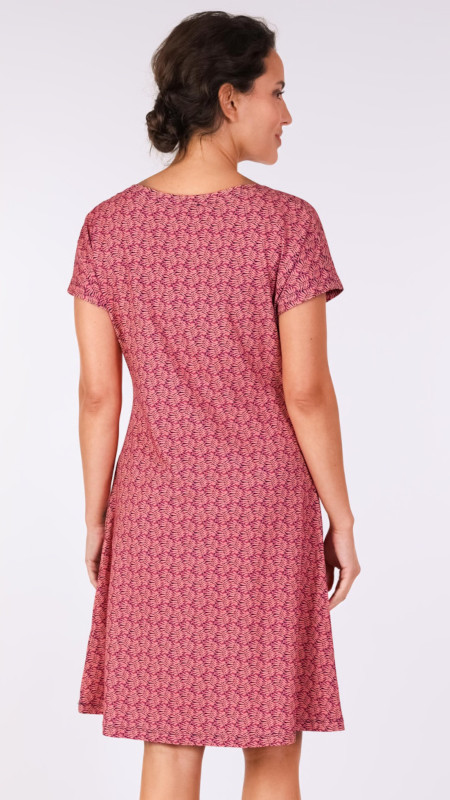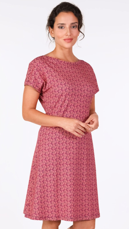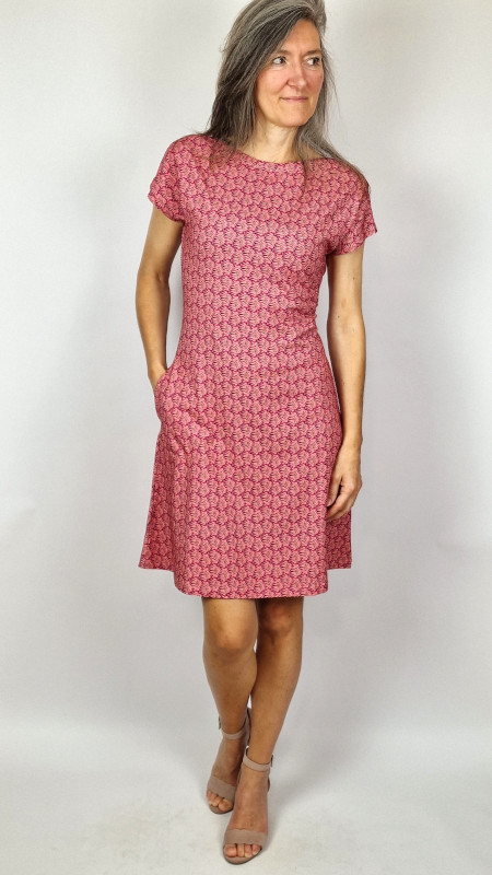 Deze jurk heeft een bescheiden boothals, korte mouwtjes, steekzakken en een uitlopende rok tot boven of op de knie (afhankelijk van je lengte).