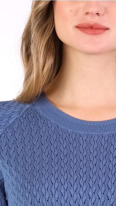 Prachtig ajour gebreid truitje dat mooi met een brede boord in de taille valt.