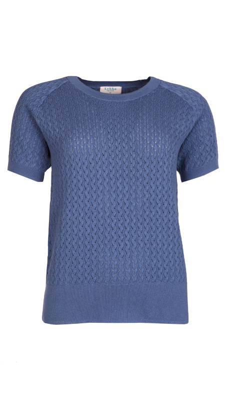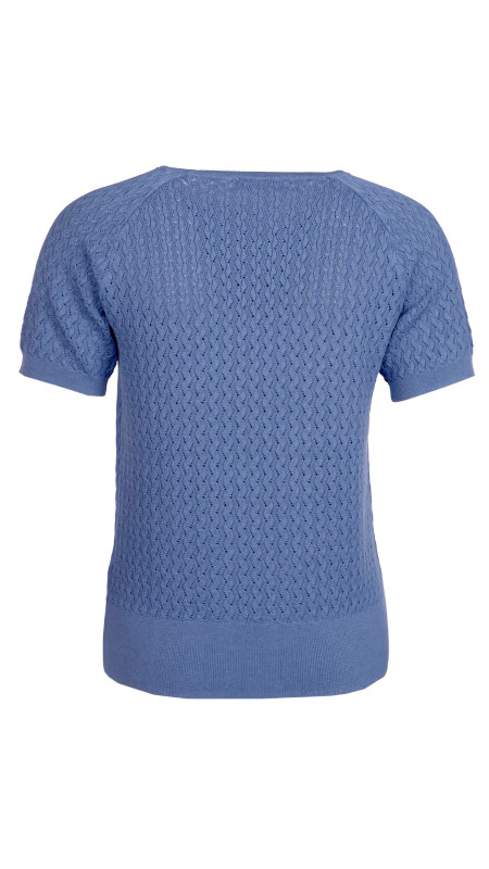 Grijsblauw zomertruitje met ronde hals en korte mouwen.