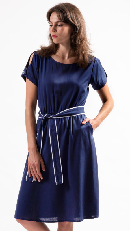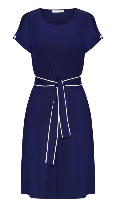 Effen donkerblauwe Mademoiselle YéYé jurk met charmante strikceintuur in de taille.