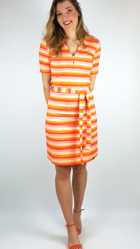 Gestreepte Mooi Vrolijk jurk in zachte tinten geel, oranje, roze en offwhite.