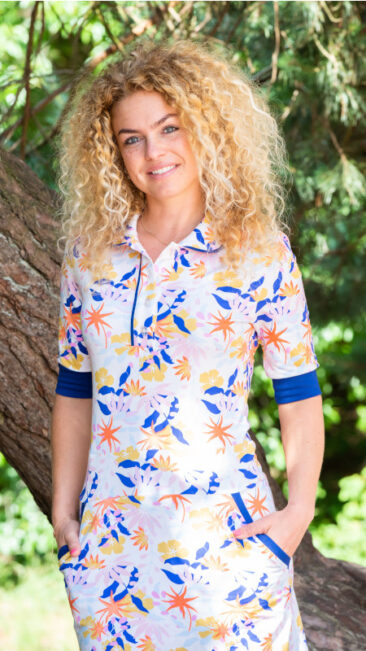 Dit is een frisse jurk met polokraagje, mouwen tot de elleboog, een brede tailleband en steekzakken.