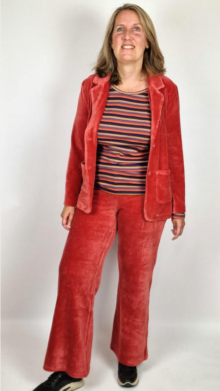 In combinatie met de broek Coral in dezelfde kleur en stof heb je een fantastisch pak; op foto 3 met een gestreept shirt van Lykka du Nord in bijpassende tinten.