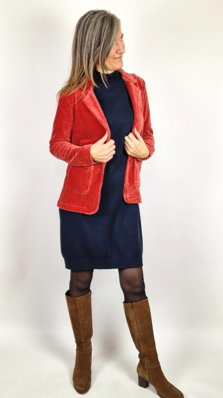 Op foto 1 draagt Evelien het jasje op een corduroy broek van Princesse nomade, op foto 2 een comfortabele combinatie met een bamboe jurk van ZILCH.