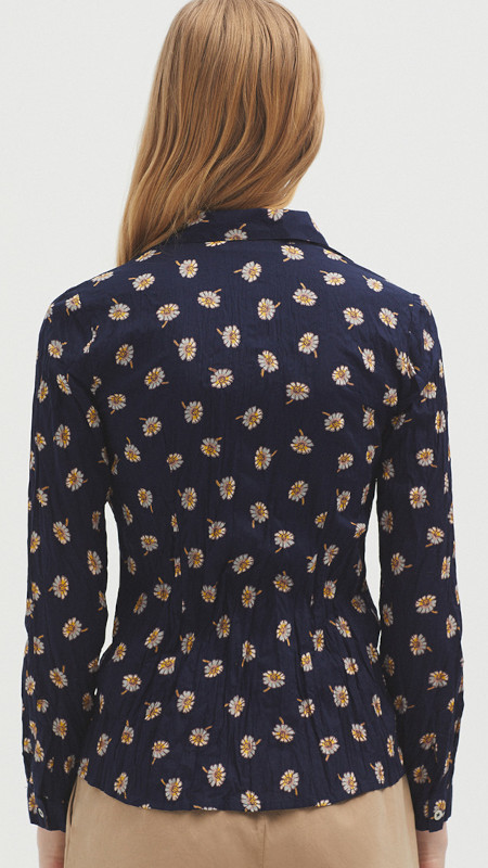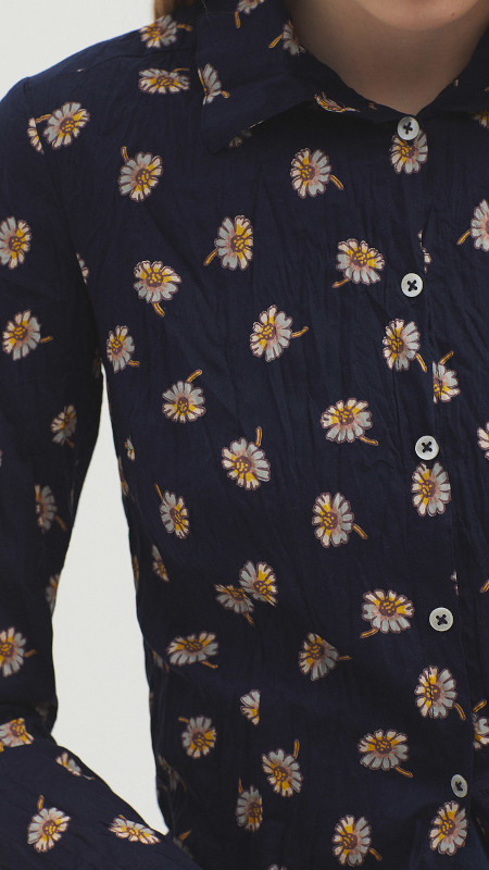 Donkerblauwe Nice Things kreukelblouse met print van over de stof zwevende bloemen in aubergine, licht grijsblauw, offwhite en geel..