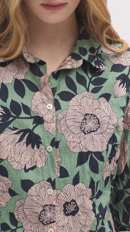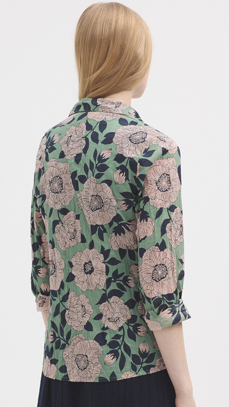 Groene Nice Things kreukelblouse met print in donkerblauw en vintage roze.