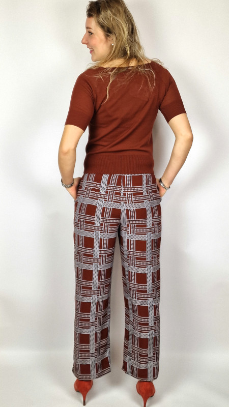 Op foto 1 wordt de broek gecombineerd met de prachtige top Square neck brown van Nice Things.