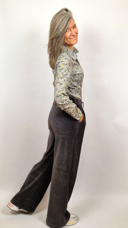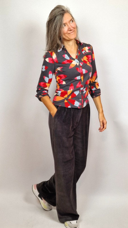Opo foto’s 1, 3 en 4 wordt de broek gcombineerd met de blouse Small Tulips van Nice Things.