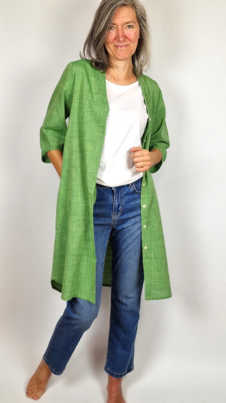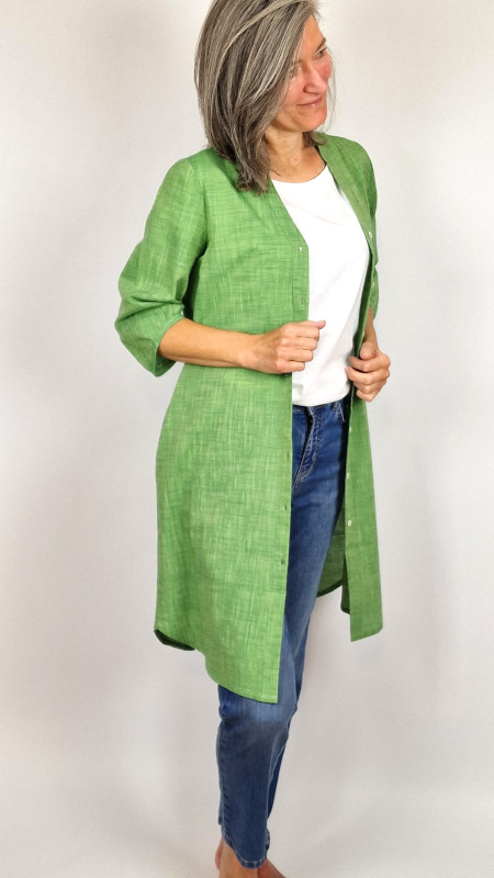 Ronde hals met een V, wijde driekwart mouwen, steekzakken en een knoopsluiting over de gehele lengte.